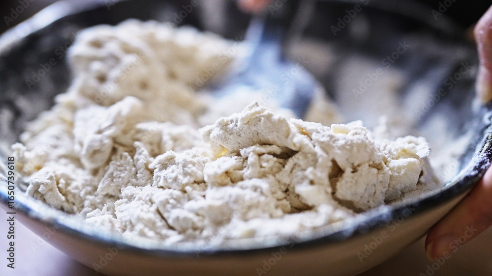 Mixing yogurt with flour for flatbread dough.