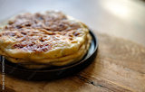 Freshly baked flatbreads served on wooden board.