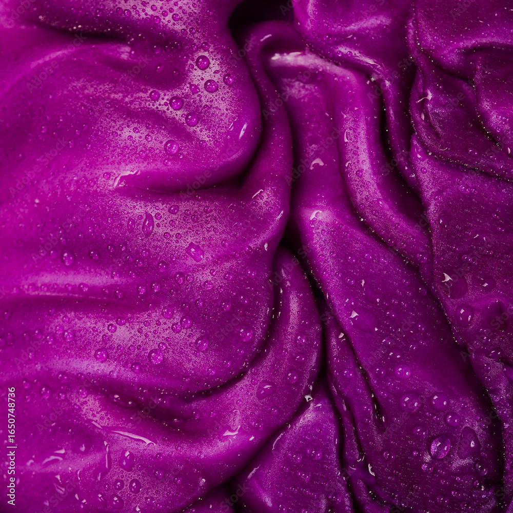 Purple cabbage with water drops lit on a black background. Macro photo. Top view.