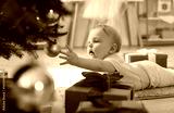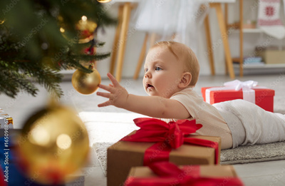 Happy small baby touching glass ball decor, first Christmas eve child on warm carpet near decorated festive tree, present boxes at home, cute little infant toddler, playing indoors, childcare love