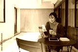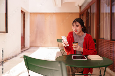 Adult Asian woman enjoys coffee outdoors using smartphone for communication freelance work at a vibrant cafe patio