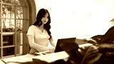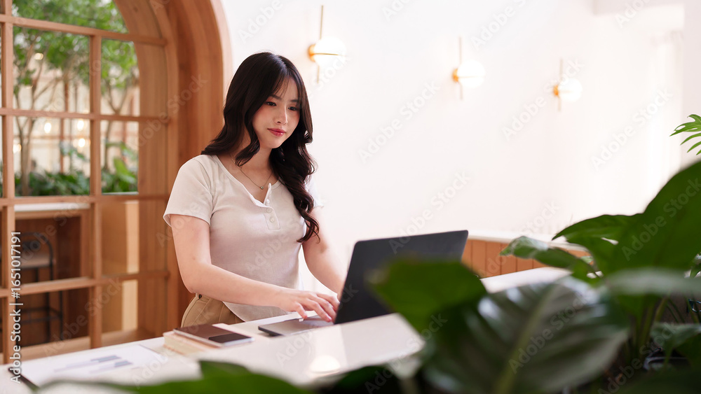 Asian adult woman remote working on laptop computer at modern cafe coworking space focused professional business task