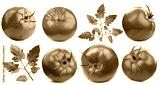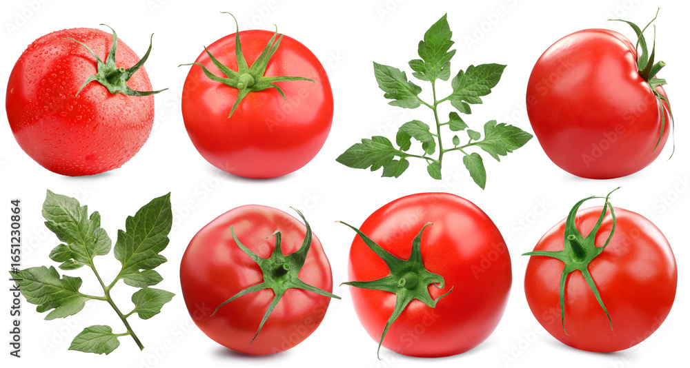 Fresh ripe tomatoes and green leaves isolated on white, set
