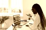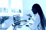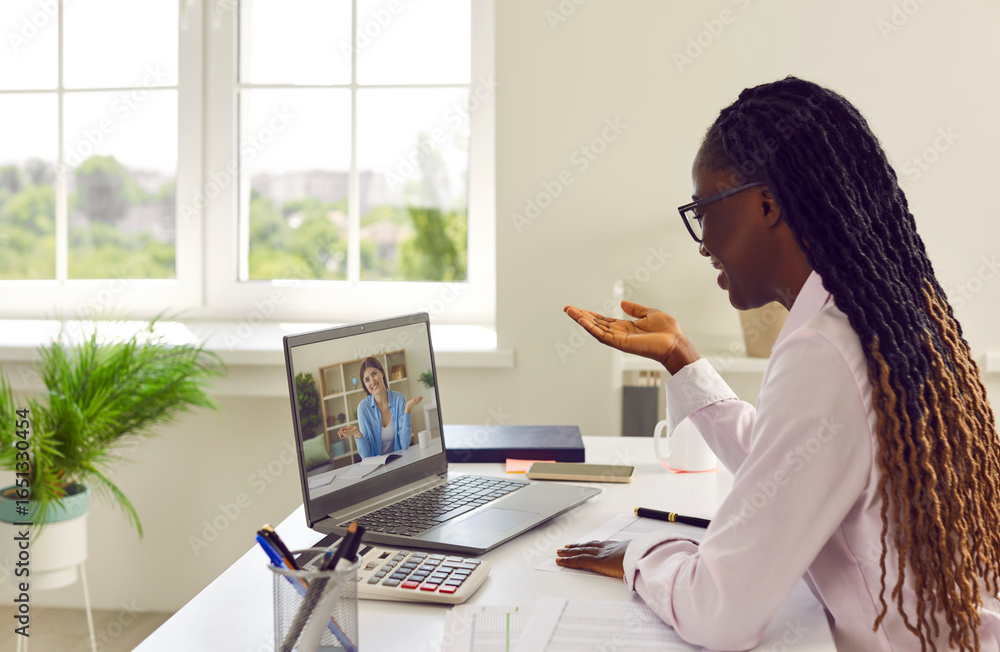 Two diverse business women having an online work meeting via a video call. African American lady sitting at her office desk, looking at her laptop computer and having a discussion with her colleague