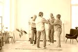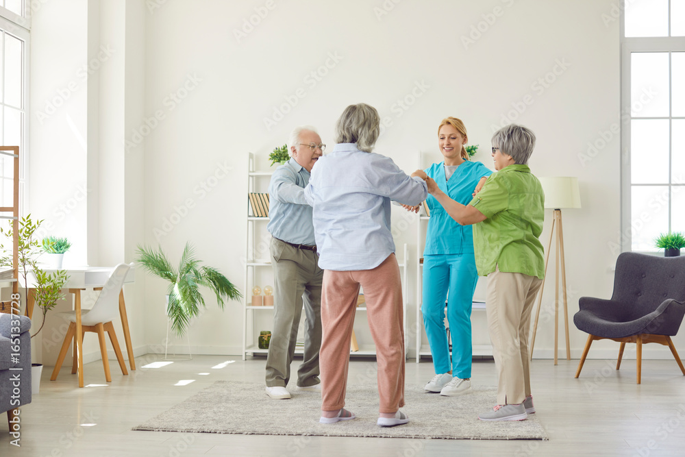 Senior old people group and caring kind nurse together doing team building activities, games, geriatric medicine caretaker helping for nursing home residents, adults in assisted living, female doctor