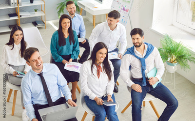Group of smiling young business people sitting in a row on chairs and listening to colleague or their leadership at working place during business training or conference in meeting room.