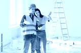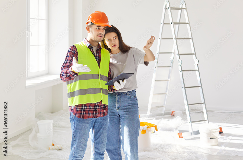 Construction worker in reflective vest and hard hat holding tablet, discussing renovation plans with young woman. Builder and client standing in new house with tools, ladder and paint supplies around.