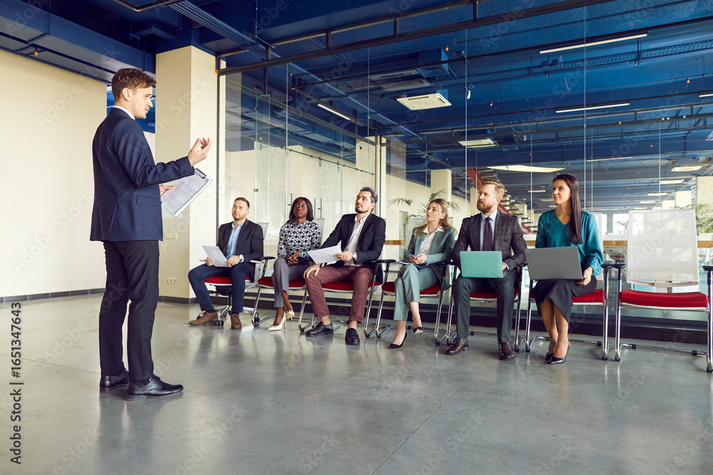 Man speaker talking on a work meeting in modern office in front of a small group of confident diverse company employees sitting on chairs in a row with laptops on a business conference.
