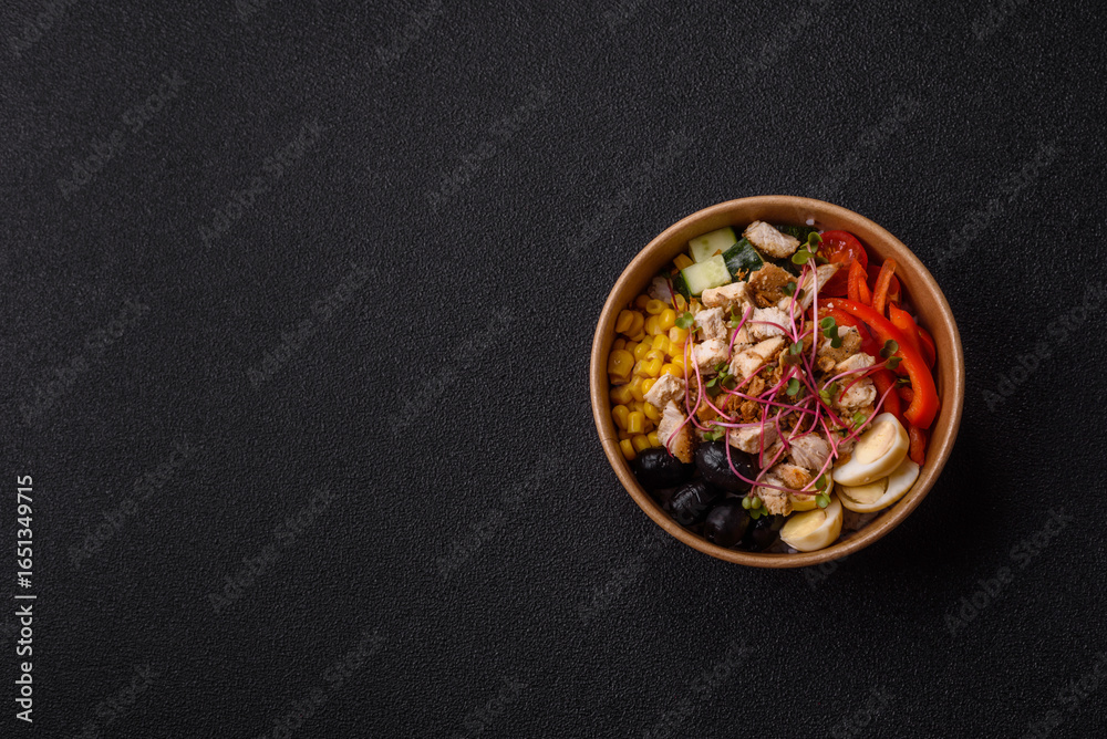 Bowl with chicken pieces, rice, tomatoes, peppers and microgreens. Bowl with chicken