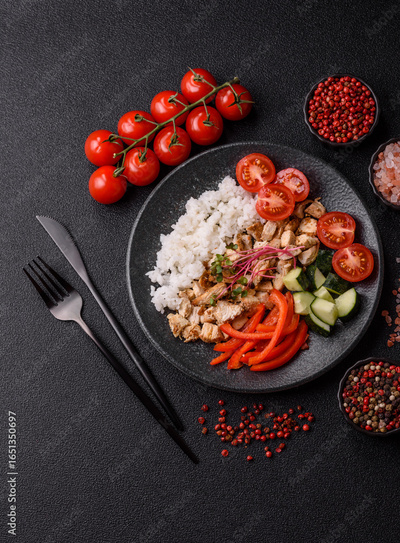Bowl with chicken pieces, rice, tomatoes, peppers and microgreens. Bowl with chicken