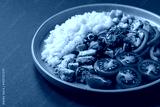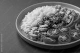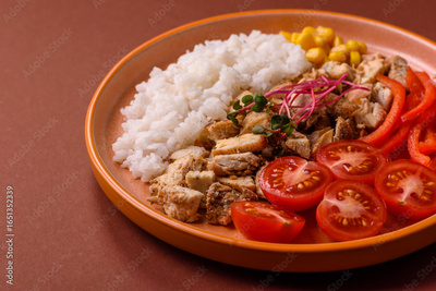 Bowl with chicken pieces, rice, tomatoes, peppers and microgreens. Bowl with chicken