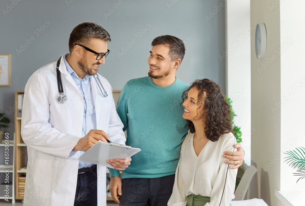 Happy healthy young family couple at appointment with doctor at clinic. Loving smiling man and woman patients discuss in vitro fertility treatment and pregnancy with gynecologist obstetrician medic