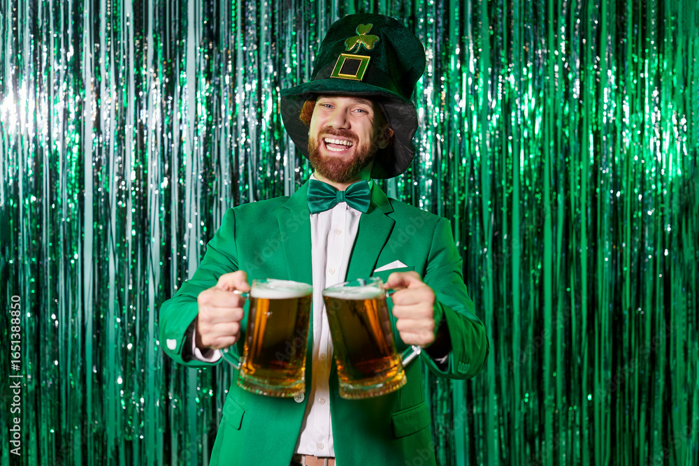 Portrait of a smiling man in a green suit holds beer glasses and a shamrock during a saint patrick day party on a shiny background. Joy and celebration of this lively irish holiday.