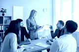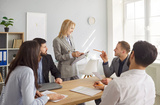 Motivated young employees asking coach at training, workshop with questions from engaged audience, female business leader interacting with team at corporate meeting, business partners share