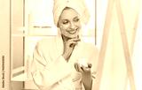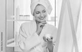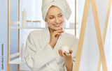Happy smiing woman applying nourishing facial skin cream, touching chin gently and looking satisfied, enjoying pampering anti aging procedures at home, wearing bathrobe and towel after shower