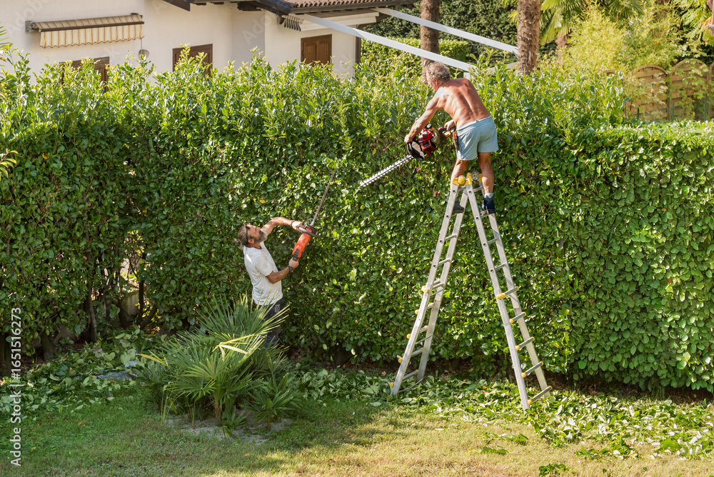 Professional gardeners cutting a hedge with hedge trimmers during autumn garden maintenance.