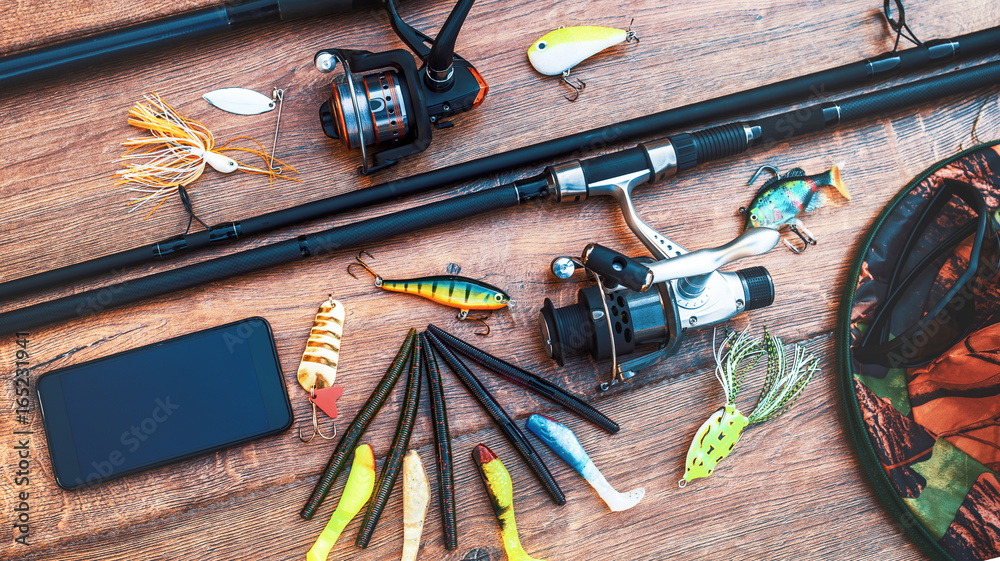 Fishing tackle on a old wooden table. Sport and recreation concept