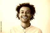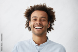 People, lifestyle, happiness and positive human expressions. Studio shot of attractive young dark-skinned student with Afro hairstyle laughing at good joke, looking at camera with carefree smile