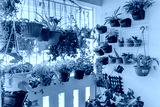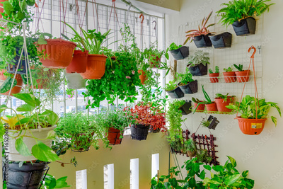 Home grown flowers and herbs in the hanging pots at balcony at Ang Mo Kio area. Growing a garden in a sharing apartments balcony/corridor is popular in Singapore. Great for urban farm publications.