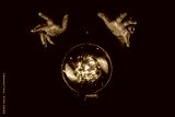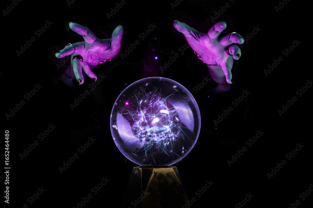 Fortune teller hands casting a spell over a crystal ball for divination, foresight, Halloween ritual in the darkness of the night