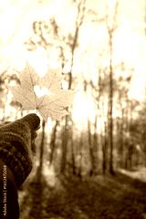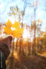Beautiful autumn nature background. yellow maple leaf with hole in shape of heart in hand outdoor. sunny autumnal forest. symbol of fall season. copy space