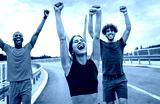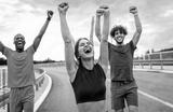 Excited group of people running together on outdoor road.