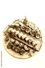 sushi mixed plate moriawase meal on plate in japanese restaurant