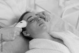 Caucasian girl receives under eye RF therapy in cosmetology clinic. Female woman cosmetologist uses advanced device to lift delicate skin, improve elasticity and reduce signs of aging and fatigue.