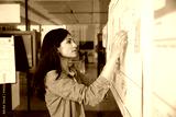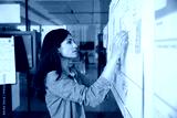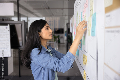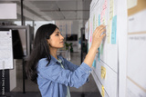 Focused young Indian project manager woman moving colorful sticky notes on scrum board, working on schedule alone, preparing strategy canvas board for presentation