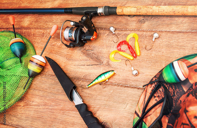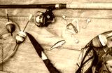 Fishing tackle on a old wooden table. Sport and recreation concept