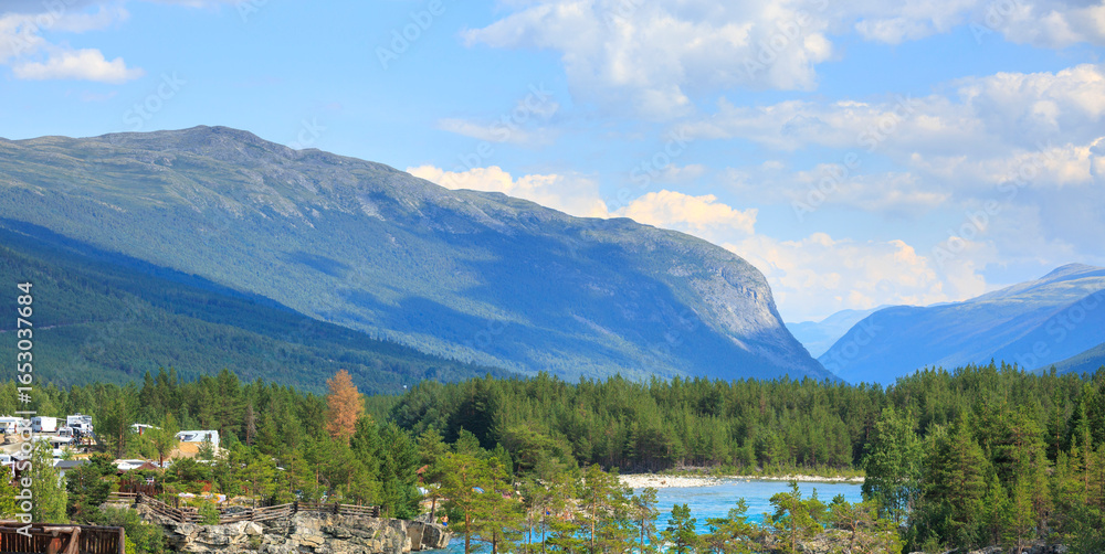 overlook the sapphire blue Dønfoss river in the forest with nordic mountain in the background in summer Norway, E6 road landscape