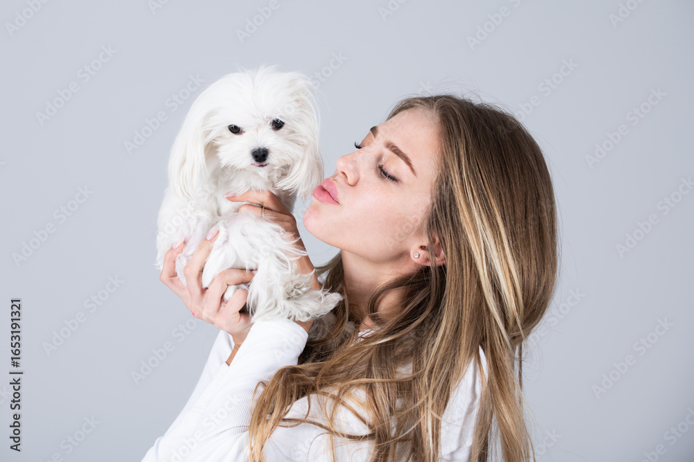 Woman kissing fluffy puppy outdoors. Girl playing with cute bolognese puppy dog. Young woman holding small white dog. Fluffy puppy. Girl tender kiss puppy. Smiling woman with dog, isolated portrait.