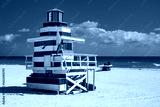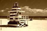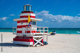 Miami Beach lifeguard at the summer beach. South Miami Beach with lifeguard. Sky above lifeguard tower in Miami. Iconic lifeguard tower on sand in Miami. A symbol of Miamis coast.