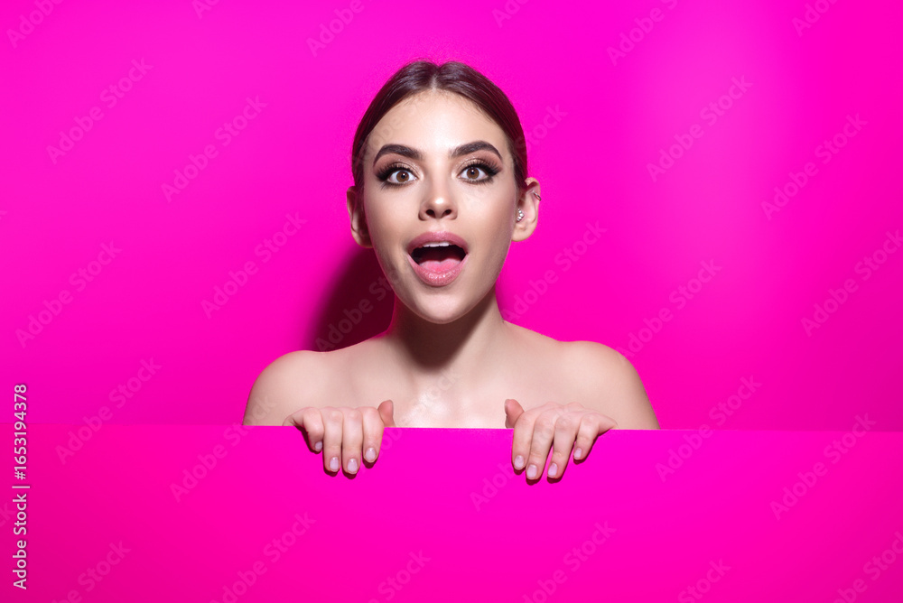 Banner sign woman with blank empty paper billboard with copy space for text. Beautiful young woman holding empty white board. Girl pointing at a blank board.