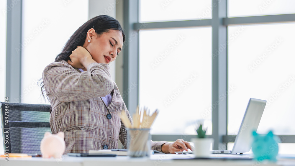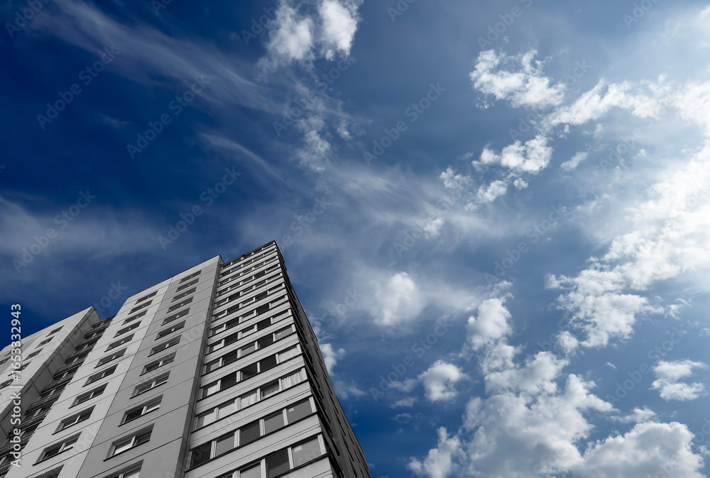Building stretches toward blue urban sky. Tall modern highrise facade with sleek window structure