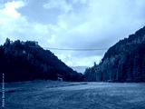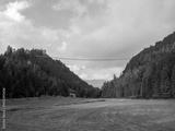 Scenic view of the Highline179 suspension bridge in Reutte, Austria, photographed from below with lush green meadows and dense forested mountains.