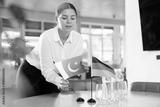 Preparing for business negotiations - woman sets small flags of countries of Germany and Pakistan on the table