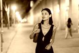 Elegant young woman walking along warmly lit urban pathway of Barcelona at night