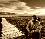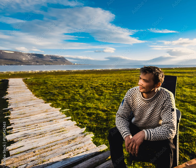 Portrait norway landscape nature of the mountains of Spitsbergen Longyearbyen Svalbard man in sweater with beard smiling lyifestyle on a polar day arctic summer in the sunset