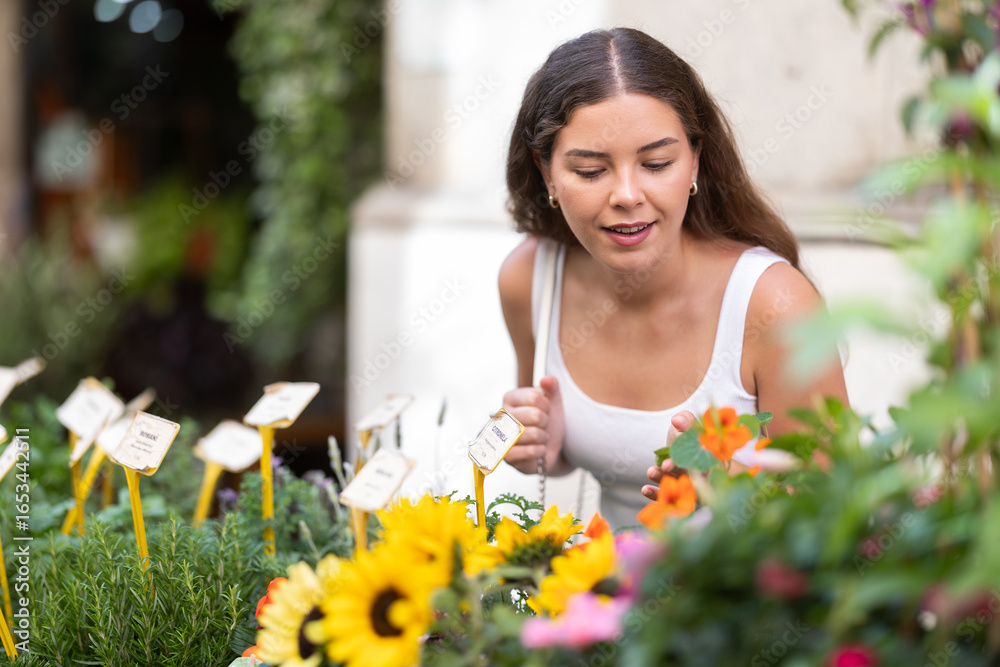 Female buyer looks at goods in outdoor shop, choose decorative potted sunflower room plants. Girl looks at contents of shop window assortment, passerby stares at goods window in store......