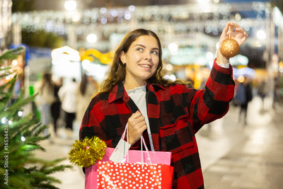 Happy girl with paper gift bags and christmas ball at street new year fair