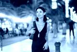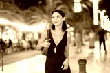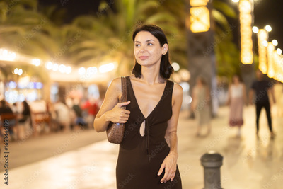 Positive young girl in dark dress walking at night along vibrant seaside promenade of Barceloneta