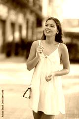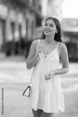 Cheerful girl in white dress walking along the street among architecture with a bag