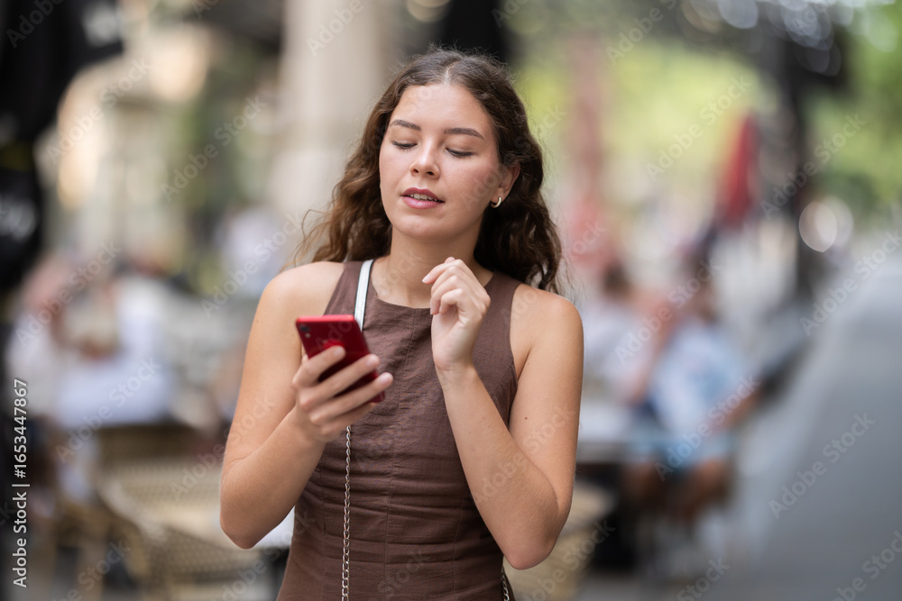 Young tourist woman looking map or searching address with smartphone walking streets of Barcelona in summer day