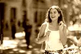 Smiling young girl in early 20s walking through summer city street, wearing light denim jeans and white tank top, relaxed and enjoying sunny day