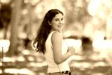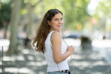 Long-haired cheerful female brunette walks along city street, spends time in motion, walks and enjoys sunny warm day, walks from university to home...