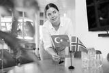 Young female assistant setting up flags of norway and turkey on table for international negotiations