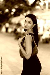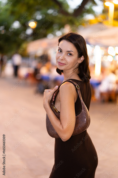 Glad young girl strolling past outdoor seating areas under umbrella in central Barcelona