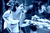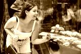 Young tourist girl near window of street cafe food court chooses sandwich with cheese. Food with you, snack on go, cheeseburger, undershot bite