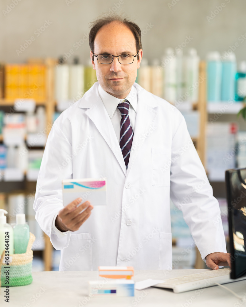 Portrait of male pharmacist working in a modern drugstore and offering to buy pills